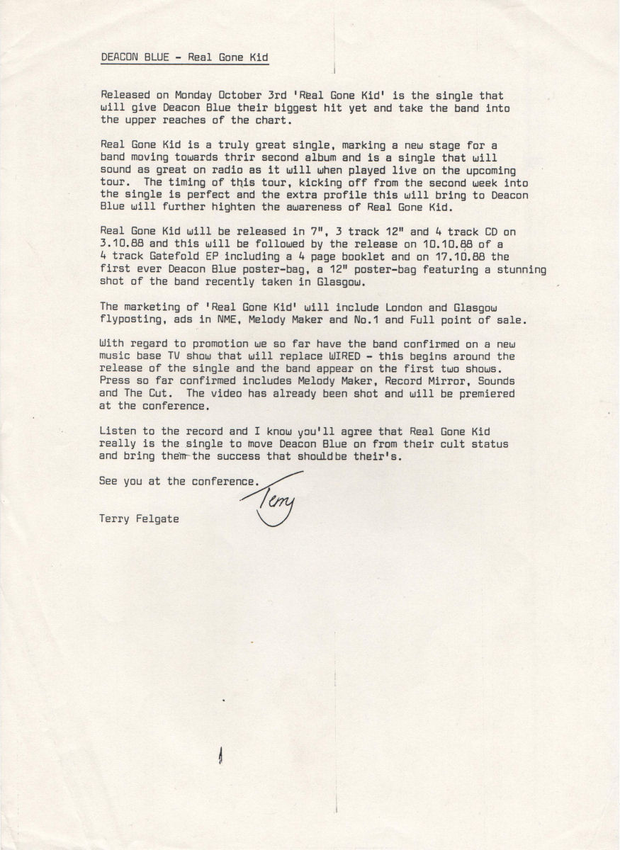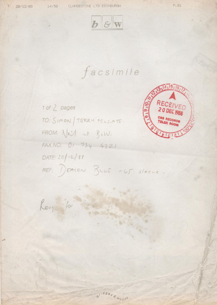 So it comes as little surprise that Circus Lights was once lined up to be the follow up single to Real Gone Kid. These faxes from Edinburgh based design company Bridges & Woods dated 20th December 1988, show the proposed artwork for the 7" single.
