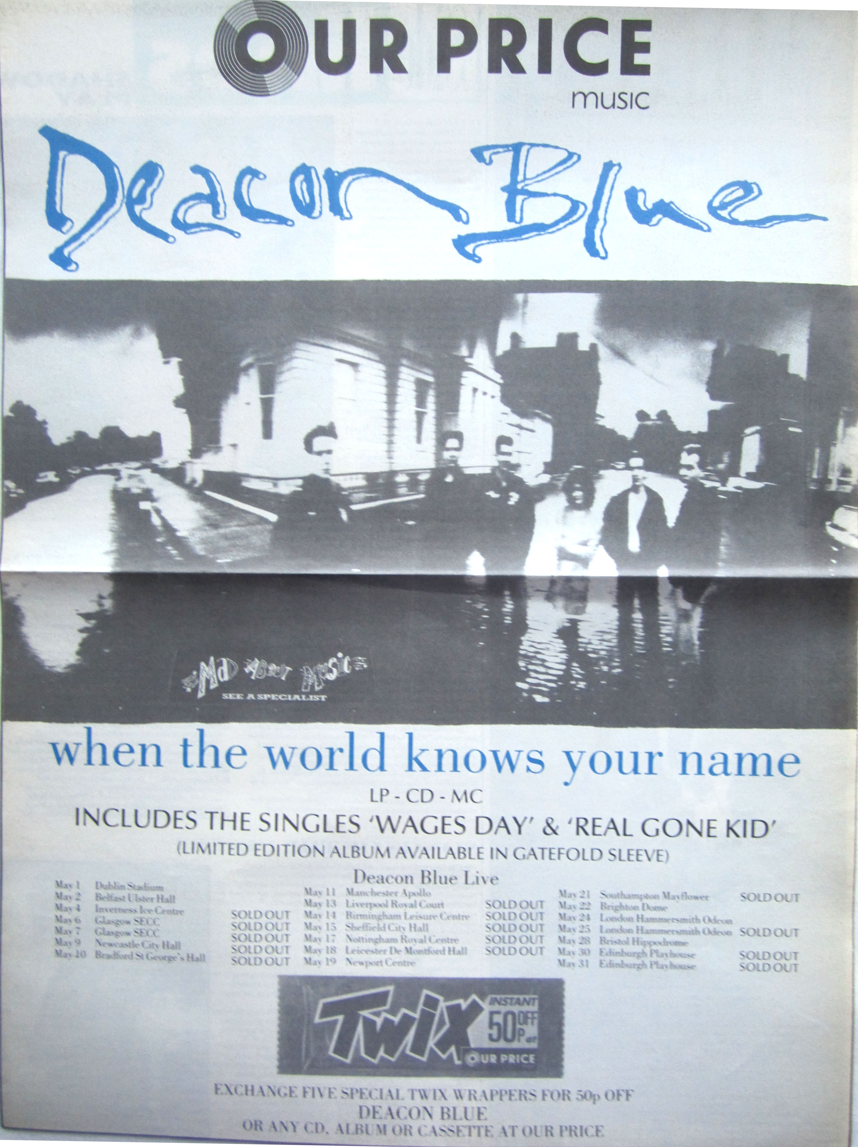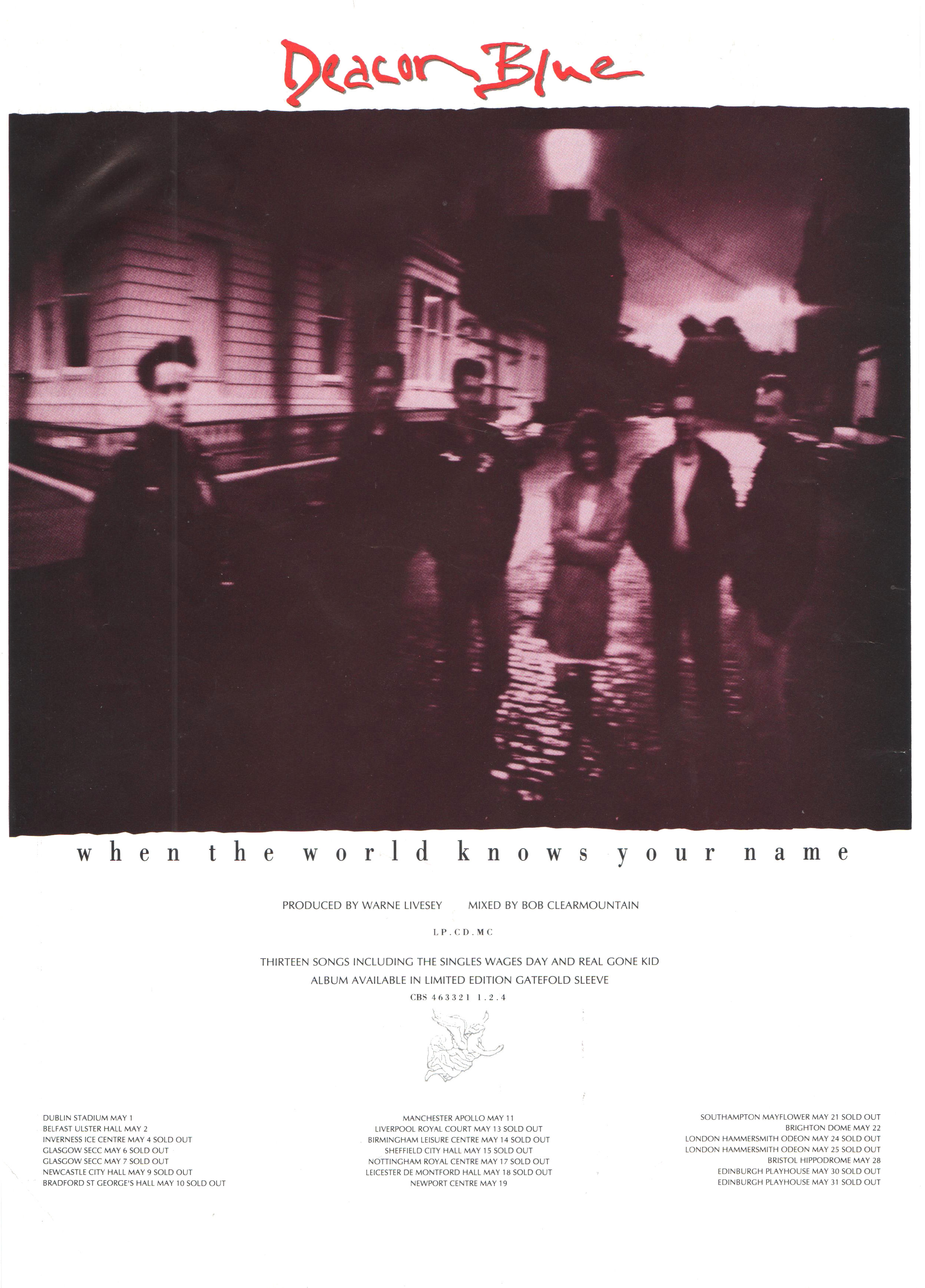 The success of Real Gone Kid had given them the dream start to the When The World Knows Your Name campaign. On it's release the album went straight in at number one knocking Madonna's "Like A Prayer" off the top of the charts. Tour dates across the UK were selling out in a matter of hours. University halls and student unions were long gone, this time it would be arenas, this time it would be 'Bigger'.